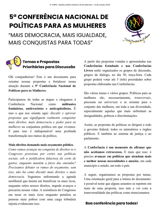 Este é o documento que orientou nossas propostas e nossa atuação durante a 5ª Conferência Nacional de Políticas para as Mulheres que aconteceu entre os dias 29 de setembro a 1º de outubro de 2025.
