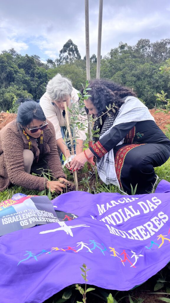 Fechamos nossas atividades com a plantação de uma 2ª muda da oliveira, colocada em uma área onde as mulheres estão construindo um pomar e horta com a discussão da soberania alimentar. Um plantio lindo, reforçando o compromisso e solidariedade feminista aqui no Brasil e no mundo inteiro!