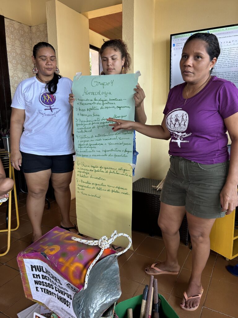 No debate sobre financeirização da natureza, denunciaram as falsas soluções para a crise climática e defenderam alternativas construídas pelas próprias comunidades, baseadas na agroecologia e na agricultura familiar. O grupo de Políticas de Cuidado refletiu sobre o avanço em políticas públicas, como a necessidade de políticas específicas para as mulheres atingidas por agrotóxicos, entre outras. O grupo de agroecologia reafirmou o papel central das mulheres na produção de alimentos saudáveis, propondo práticas de intercâmbio de saberes e fortalecimento da economia solidária.